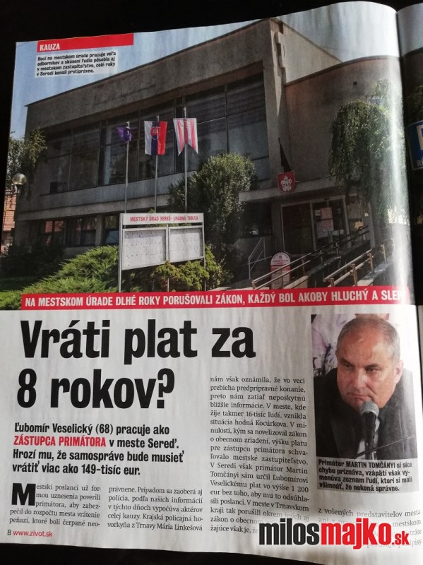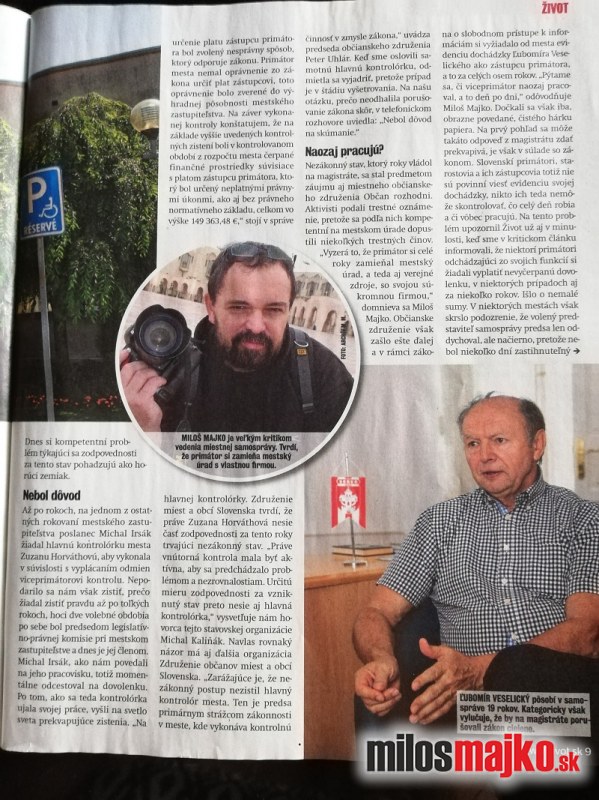 Dnes by ste ešte mali mať možnosť zakúpiť si časopis ŽIVOT, ktorý sa v článku  pod tiulom  “  Venuje nazákonne vyplácaným odmenám viceprimátorovi Veselickému počas 8 rokov jeho pôsobenia vo funkcii. Ide teda o dve volebné obdobia, počas ktorých ich bez právneho základu, teda svojvolne  Veselickému  určil primátor  Martin Tomčányi.