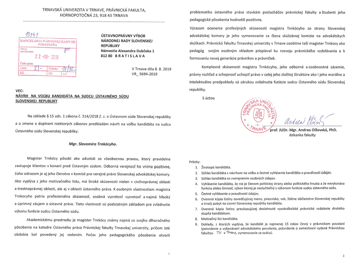 Pýtame sa preto verejne – na základe uverejnených informácií  je práve  Mgr. Slavomír Trnkócy  odborne a morálne tým najlepším kandidátom na  sudcu  Ústavného súdu?