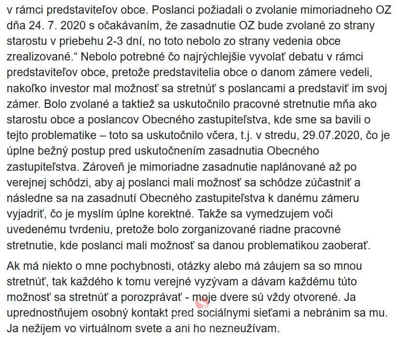 Ďalej je v článku uvedené: „Ďalšou iniciatívou bola individuálna snaha piatich poslancov OZ o zvolanie mimoriadneho zasadnutia OZ v čo najkratšom čase, aby sa čo najrýchlejšie rozprúdila diskusia na túto tému aj v rámci predstaviteľov obce. Poslanci požiadali o zvolanie mimoriadneho OZ dňa 24. 7. 2020 s očakávaním, že zasadnutie OZ bude zvolané zo strany starostu v priebehu 2-3 dní, no toto nebolo zo strany vedenia obce zrealizované.“ Nebolo potrebné čo najrýchlejšie vyvolať debatu v rámci predstaviteľov obce, pretože predstavitelia obce o danom zámere vedeli, nakoľko investor mal možnosť sa stretnúť s poslancami a predstaviť im svoj zámer. Bolo zvolané a taktiež sa uskutočnilo pracovné stretnutie mňa ako starostu obce a poslancov Obecného zastupiteľstva, kde sme sa bavili o tejto problematike – toto sa uskutočnilo včera, t.j. v stredu, 29.07.2020, čo je úplne bežný postup pred uskutočnením zasadnutia Obecného zastupiteľstva. Zároveň je mimoriadne zasadnutie naplánované až po verejnej schôdzi, aby aj poslanci mali možnosť sa schôdze zúčastniť a následne sa na zasadnutí Obecného zastupiteľstva k danému zámeru vyjadriť, čo je myslím úplne korektné. Takže sa vymedzujem voči uvedenému tvrdeniu, pretože bolo zorganizované riadne pracovné stretnutie, kde poslanci mali možnosť sa danou problematikou zaoberať.
