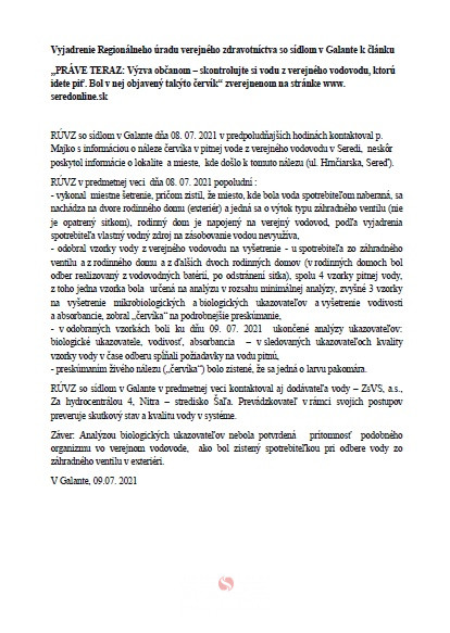 AKTUALIZOVANÉ – 9.7.2021 10.57 hod. – vyjadrenie regionálnej hygieničky RÚVZ v Galante„Dobrý deň, podľa vyjadrenia odborných pracovníkov laboratória RÚVZ Trnava sa jedná o larvu pakomára, predbežné laboratórne výsledky včerajšieho odberu vody v domácnosti na Hrnčiarskej ulici v Seredi svedčia o vyhovujúcej kvalite pitnej vody v sledovaných ukazovateľoch. Podľa informácií od dodávateľa vody bude dnes vykonaná analýza stavu u odberateľa p. Živojinovej aj u najbližších odberateľov. Po obdržaní definitívnych výsledkov laboratórnej analýzy vzoriek vody bude na našej webovej stránke zverejnené naše stanovisko“.