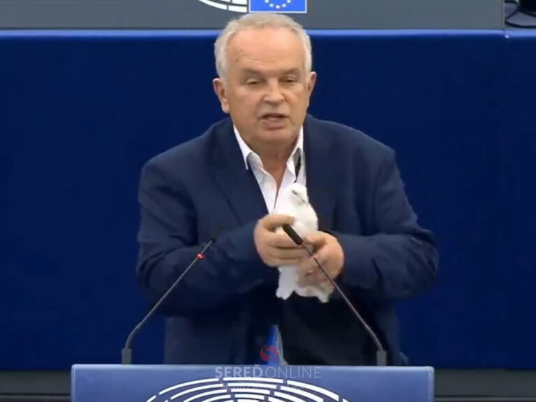 Poslanec za Slovensko v EP Radačovský počas vystúpenia v interiéri rokovacej sály vypustil bielu holubicu